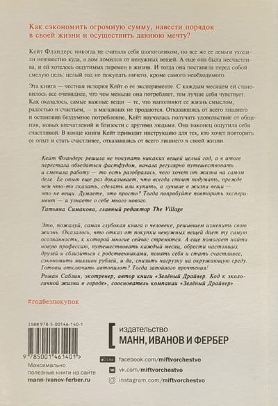Кейт Фландерс поставила перед собой смелую цель: целый год не покупать ничего, кроме самого необходимого. Эта книга — история Кейт о ее эксперименте. За год ей удалось сэкономить огромную сумму, навести порядок в жизни и осуществить давнюю мечту.