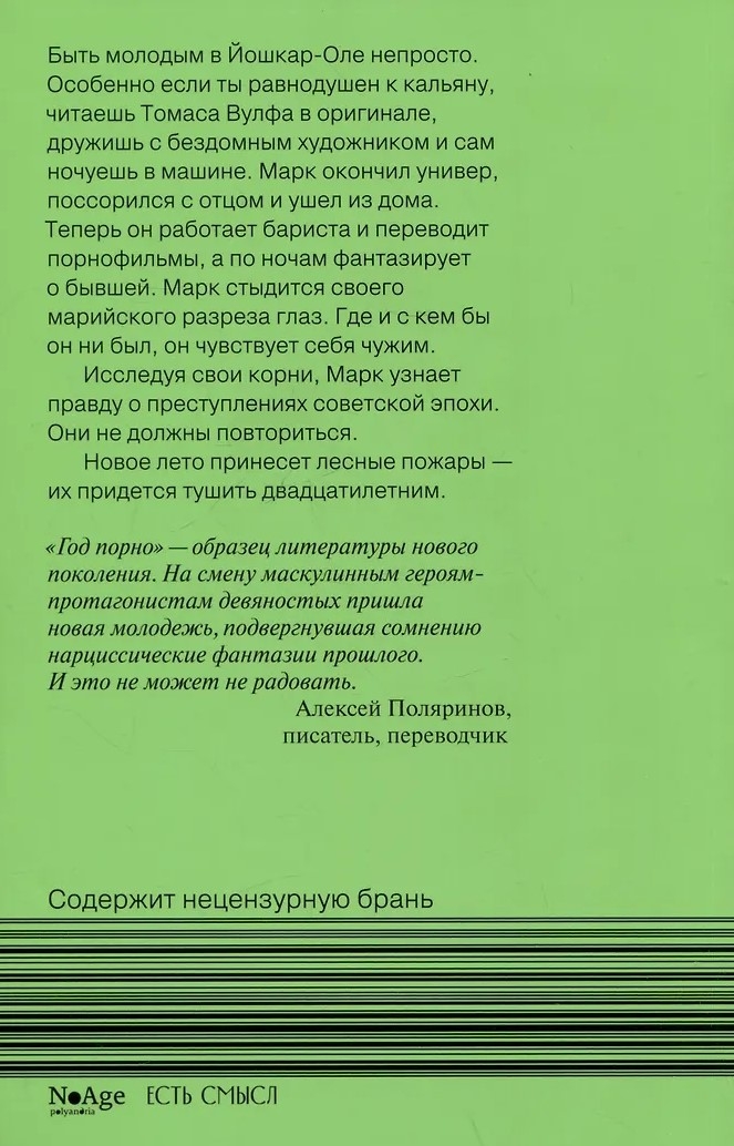 Быть молодым в Йошкар-Оле непросто. Особенно если ты равнодушен к кальяну, читаешь Томаса Вулфа в оригинале, дружишь с бездомным художником и сам ночуешь в машине. Марк окончил универ, поссорился с отцом и ушел из дома. Теперь он работает бариста и переводит порнофильмы, а по ночам фантазирует о бывшей. Марк стыдится своего марийского разреза глаз. Где и с кем бы он ни был, он чувствует себя чужим. Исследуя свои корни, Марк узнает правду о преступлениях советской эпохи. Они не должны повториться. Новое лето принесет лесные пожары — их придется тушить двадцатилетним.  «Год порно» — образец литературы нового поколения. На смену маскулинным героям-протагонистам девяностых пришла новая молодежь, подвергнувшая сомнению нарциссические фантазии прошлого. И это не может не радовать.
