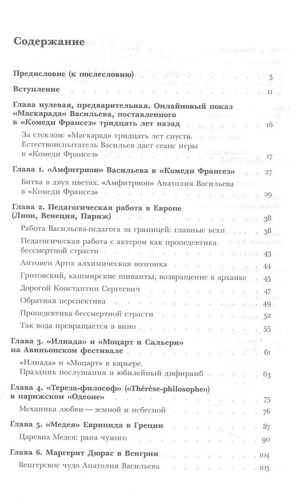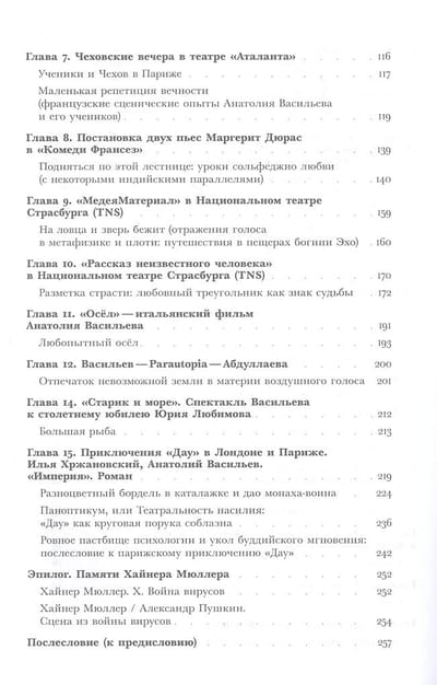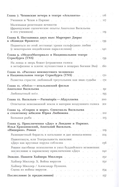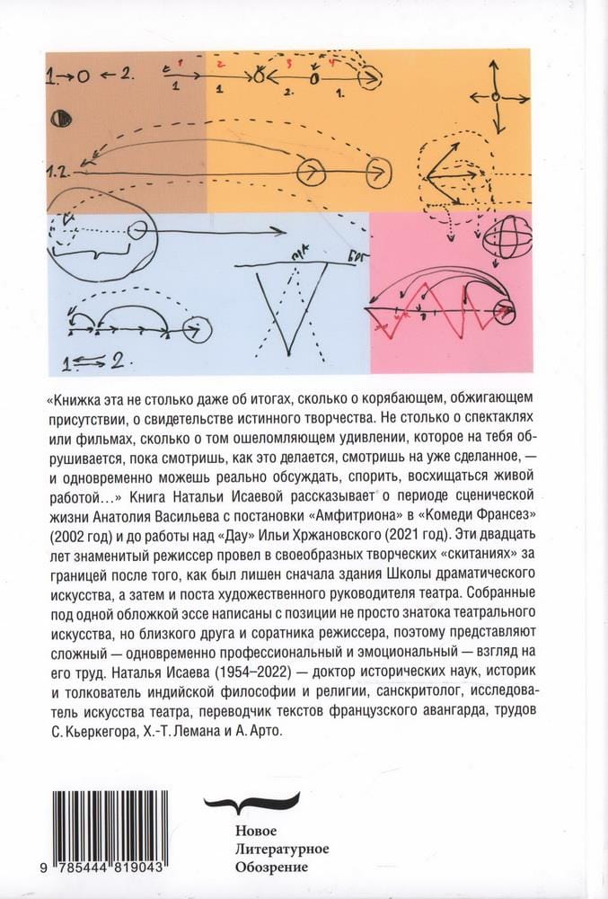 «Книжка эта не столько даже об итогах, сколько о корябающем, обжигающем присутствии, о свидетельстве истинного творчества. Не столько о спектаклях или фильмах, сколько о том ошеломляющем удивлении, которое на тебя обрушивается, пока смотришь, как это делается, смотришь на уже сделанное, — и одновременно можешь реально обсуждать, спорить, восхищаться живой работой…» Книга историка философии, переводчика и театроведа Натальи Исаевой рассказывает о периоде сценической жизни Анатолия Васильева с постановки «Амфитриона» в «Комеди Франсез» (2002 год) и до работы над «Дау» Ильи Хржановского (2021 год). Эти двадцать лет знаменитый режиссер провел в своеобразных творческих «скитаниях» за границей после того, как был лишен сначала здания Школы драматического искусства, а затем и поста художественного руководителя театра. Собранные под одной обложкой эссе написаны с позиции не просто знатока театрального искусства, но близкого друга и соратника режиссера, поэтому представляют сложный — одновременно профессиональный и эмоциональный — взгляд на его труд.