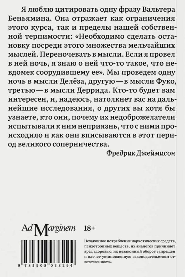 В серии лекций для магистрантов и вольнослушателей, прочитанных в Университете Дьюка весной 2021 года, американский философ и критик Фредрик Джеймисон (1934–2024) освещает основные вехи французской теории: экзистенциализм, структурализм, постструктурализм, семиотику, феминизм, психоанализ и марксизм, вписывая этот бурный период мысли в контекст значимых европейских политических событий: освобождение Парижа, Алжирскую войну, майские восстания 1968-го и создание ЕС. Джеймисон оживляет философские дебаты этого периода, обращаясь к работам и эпизодам из жизни Сартра, Бовуар, Фанона, Барта, Фуко, Альтюссера, Деррида, Делёза, групп Tel Quel и Cahiers du Cinéma, а также таких мыслителей, как Рансьер и Бадью, представляя свой взгляд на один из важнейших моментов интеллектуальной истории.