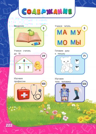 В ней представлены все основные направления дошкольного образования: грамота, математика, подготовка руки к письму, развитие речи, памяти, внимания и мышления. Кроме того, малыши узнают о строении тела человека, познакомятся с этикетом и смогут собрать забавные поделки-оригами.
