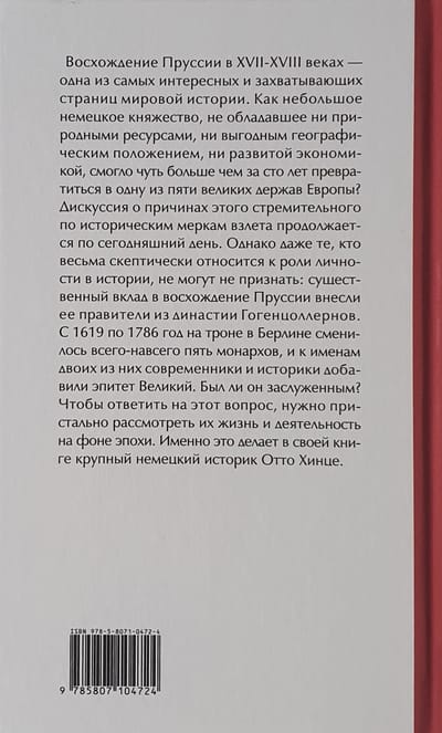 Работа крупного немецкого ученого Отто Хинце посвящена истории правителей из династии Гогенцоллернов в период от Тридцатилетней войны до конца XVIII века. Это было время «восхождения Пруссии». За полтора века небольшое немецкое княжество превращается в одну из великих держав Европы, и немалую роль в этом играют его правители. В работе рассматривается деятельность Гогенцоллернов на фоне эпохи, внимание уделяется как внешней, так и внутренней политике Пруссии.