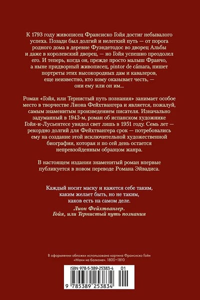 Роман «Гойя, или Тернистый путь познания» занимает особое место в творчестве Лиона Фейхтвангера и является, пожалуй, самым знаменитым произведением писателя. Изначально задуманный в 1943-м, роман об испанском художнике Гойя-и-Лусьентесе увидел свет лишь в 1951 году. Семь лет — рекордно долгий для Фейхтвангера срок — потребовались ему на создание этой исключительной художественной биографии, которая и по сей день остается непревзойденным образцом жанра.