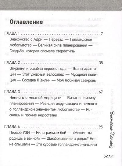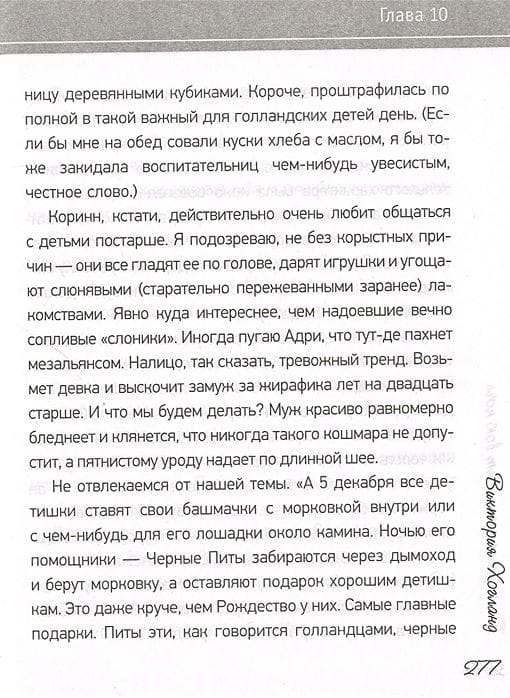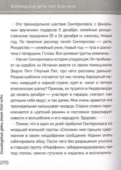 "...На велосипеде я кататься, кстати, не умела. Зрелище панической меня, с вытаращенными глазами виляющей на велодорожке, как пьяный олень, вписано золотыми буквами в историю нашей тихой деревни. “Извините, я почти задавила вашу собаку!” – орала я на английском строгому дедушке. “Понимаете, это мой первый велосипед!” – доносил ветер мои жалкие оправдания до соседки, на которую я чуть не обрушилась, пытаясь развернуть железного коня. Адри к моим экзерсисам относился спокойно, только просил никому не говорить, что я его жена. ...Голландское родительство мне нравится тем, что оно такое снисходительно-расслабленное. Есть крохотный человечек. С ним связан набор определенных действий. Мне кажется, это нельзя называть равнодушием – скорее экономией душевных сил и энергии. Спокойным принятием своего нового статуса. Без разыгрывания драмы на кухне, где в главных ролях строптивый биологический кабачок, сломавшийся блендер и голодный плачущий ребенок. Нравится вам возиться часами, перемалывая овощи в кашку – прекрасно! А если нет – в соседнем супермаркете пять полок забиты детским питанием на любой вкус. Ситуация разрешена, все целы, идем дальше. И никаких там "чего хочет ваш малыш", "совместный сон по требованию", "природе виднее" и прочее. По мнению голландцев, вы родили себе ни что иное, как щекастый кусочек паззла, и ваша задача теперь – установить его на правильное место в семье, дополнив всю картину. А не смешивать в истеричном припадке остальные детали, трясущимися руками выкладывая слово "вечность" из всем известных четырех букв".
