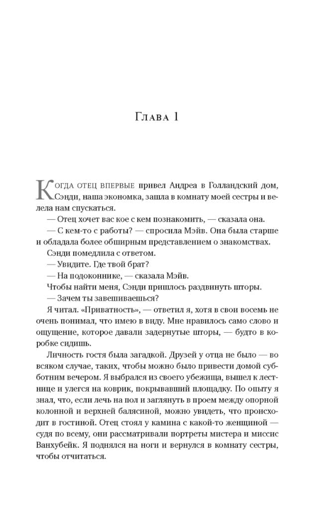 Новый роман американской писательницы Энн Пэтчетт напоминает сказку братьев Гримм, разросшуюся до масштабов семейного эпоса. История главных героев, Дэнни Конроя и его сестры Мэйв, охватывает всю вторую половину ХХ века, а их судьбы оказываются роковым образом переплетены с Голландским домом — особняком на востоке Пенсильвании, когда-то принадлежавшим разорившейся династии нидерландских магнатов Ванхубейков. Сам по себе Голландский дом не населен призраками, но каждый, кто переступает его порог, в каком-то смысле становится призраком дома — куда бы он потом ни отправился, где бы впоследствии ни жил, повсюду носит с собой этот образ. У Дэнни и Мэйв только это и есть: безвременно ушедший из жизни отец, давным-давно превратившаяся в воспоминание мать, будто бы вышедшая из ночного кошмара мачеха и зловещий фамильный особняк. А также взрослая жизнь, которая все никак не начнется: проклятие детства, печать сиротства, невозможность разорвать однажды сформировавшиеся узы. «Голландский дом» — история о победе любви над злом. Победе, замешенной на потерях и во многом неочевидной, потому что в конечном счете читателю предстоит разобраться самому, на чьей он стороне и был ли здесь злодей. И если был — то кто?
