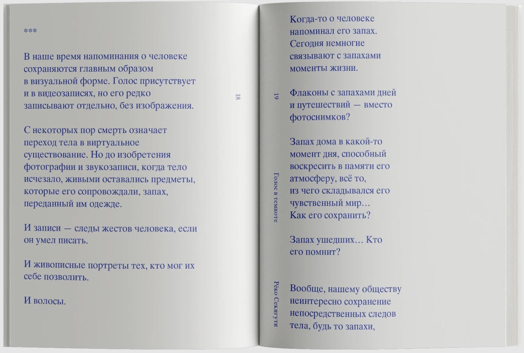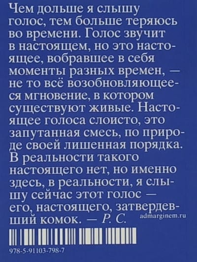 Рёко Секигути, японская поэтесса и французская эссеистка, автор переведенных на русский язык книг «Нагори» и «961 час в Бейруте», всегда, что бы ни становилось темой ее произведений — японские представления о смене сезонов, жизнь многоликого и многоголосого левантийского города, трагедия в Фукусиме и т. д. — пишет о том, как устроено время и как мы с ним «договариваемся», помня, забывая, смакуя мгновения и не замечая пролетающих лет. В этом коротком тексте, соединяющем в себе черты дневниковых заметок, стихотворения в прозе и философского эссе, проявителем времени становится человеческий голос, парадоксальным образом всегда существующий в настоящем.