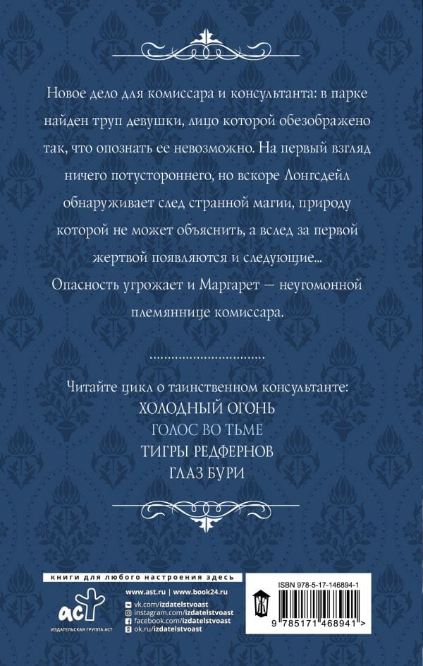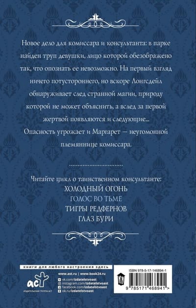 Новое дело для комиссара и консультанта: в парке найден труп девушки, лицо которой обезображено так, что опознать ее невозможно. На первый взгляд ничего потустороннего, но вскоре Лонгсдейл обнаруживает след странной магии, природу которой не может объяснить, а вслед за первой жертвой появляются и следующие... Опасность угрожает и Маргарет - неугомонной племяннице комиссара.