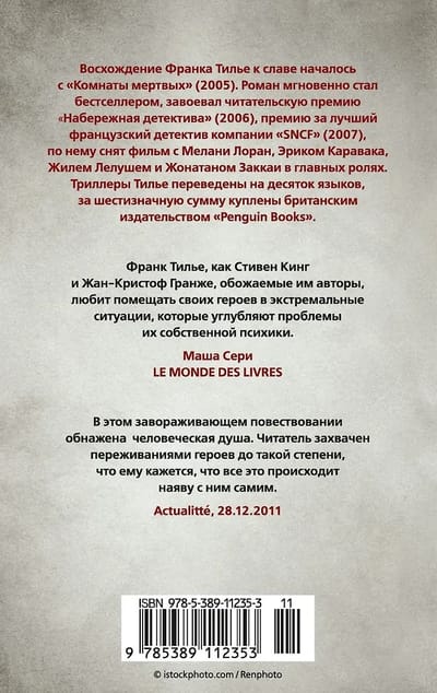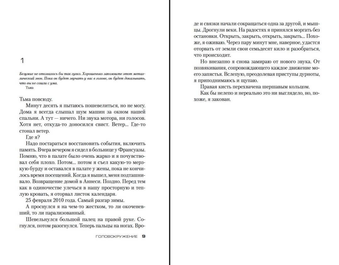 В триллере «Головокружение» писателю удается создать леденящую и одновременно удушающую атмосферу захлопнувшейся ловушки. Герой романа альпинист Жонатан Тувье, покоривший главные вершины планеты, однажды ночью вдруг обнаруживает, что прикован к скале в странной пещере, выход из которой завален. Вокруг холод, лед, тьма, рядом его пес и два незнакомца: один, как и Тувье, прикован цепью к скале, другой может передвигаться, но на нем железная маска с кодовым замком, которая взорвется, если он в поисках спасения переступит красную линию. Невольные узники теряются в догадках: как и из-за чего они оказались здесь, кто манипулирует ими? Но главный вопрос звучит так: до какой степени отчаяния и озверения способен дойти человек, чтобы выжить?..