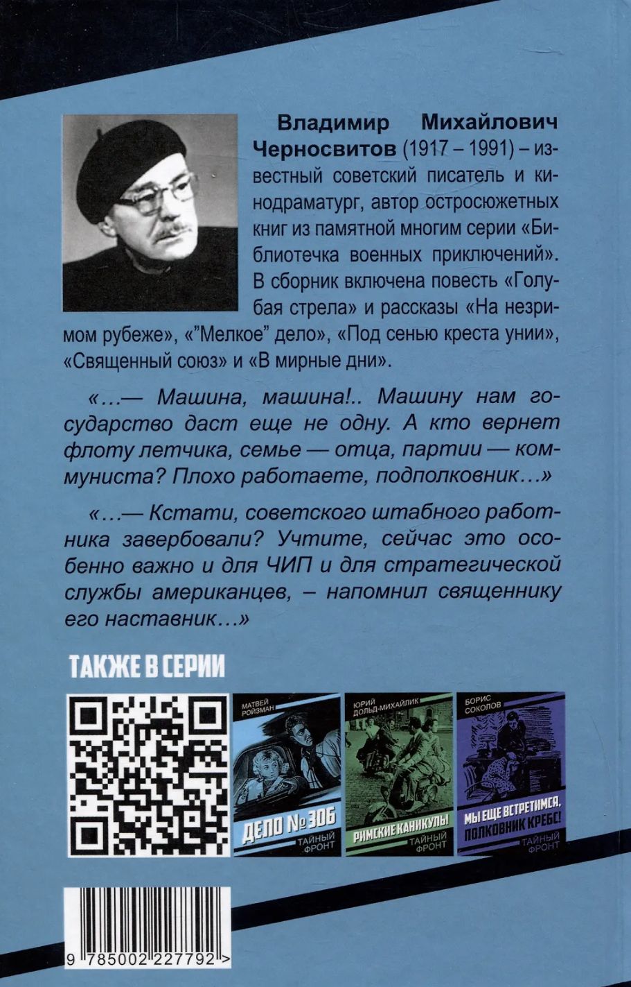 Владимир Михайлович Черносвитов (1917–1991) – известный советский писатель и кинодраматург, автор остросюжетных книг из памятной многим серии «Библиотечка военных приключений». В сборник включена повесть «Голубая стрела» и рассказы «На незримом рубеже», «”Мелкое” дело», «Под сенью креста унии», «Священный союз» и «В мирные дни». Послевоенные годы… Идут учения Черноморского флота, на которых готовятся испытания сверхсекретного самолета «Голубая стрела». Конечно же, разведка «одной иностранной державы» не могла оставить такие события без внимания. Советским контрразведчикам и морякам предстоит встретится с агентами врага и расстроить их планы.