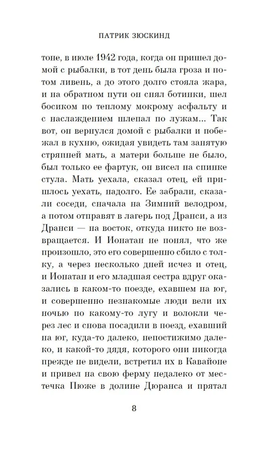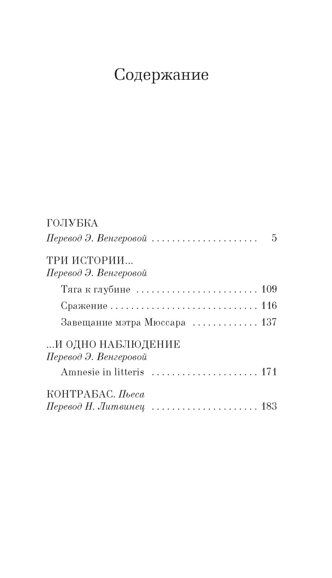 Патрик Зюскинд относится к числу самых популярных писателей ХХ века. Правда, нередко его называют автором лишь одного романа — «Парфюмер». Познакомившись с этой книгой, читатель легко убедится, что такое мнение ошибочно. Под одной обложкой собраны повесть «Голубка» («маленький шедевр в прозе»), четыре сравнительно коротких, но бесспорно интересных рассказа и пьеса «Контрабас», первое произведение Зюскинда, в котором поднимается тема «маленького» человека. Здесь автор раскрывается как великолепный психолог, мистификатор, человек, наделенный тонким чувством юмора и редкой фантазией.