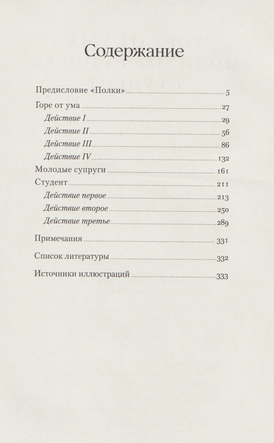 Собрание пьес одного из главных русских драматургов: ранние «Молодые супруги» и «Студент» и, конечно, «Горе от ума» — самая хрестоматийная русская комедия, неисчерпаемый источник пословиц и паноптикум бессмертных типажей.