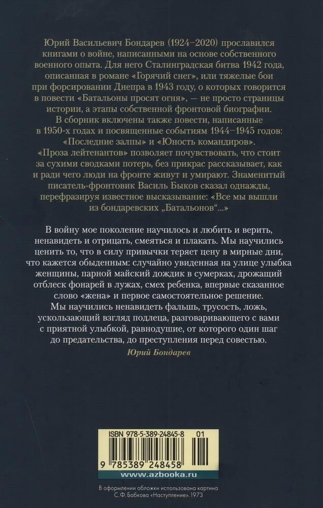 Юрий Васильевич Бондарев (1924–2020) прославился книгами о войне, написанными на основе собственного военного опыта. Для него Сталинградская битва 1942 года, описанная в романе «Горячий снег», или тяжелые бои при форсировании Днепра в 1943 году, о которых говорится в повести «Батальоны просят огня», — не просто страницы истории, а этапы собственной фронтовой биографии.