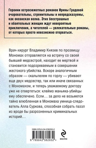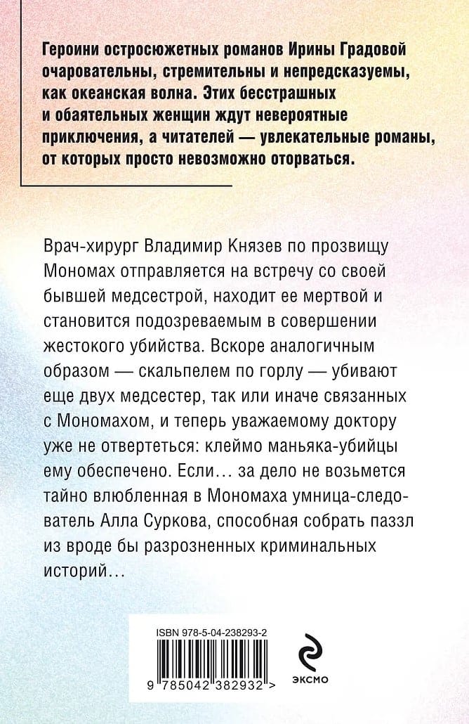 Врач-хирург Владимир Князев по прозвищу Мономах отправляется на встречу со своей бывшей медсестрой, находит ее мертвой и становится подозреваемым в совершении жестокого убийства. Вскоре аналогичным образом — скальпелем по горлу — убивают еще двух медсестер, так или иначе связанных с Мономахом, и теперь уважаемому доктору уже не отвертеться: клеймо маньяка-убийцы ему обеспечено. Если… за дело не возьмется тайно влюбленная в Мономаха умница-следователь Алла Суркова, способная собрать паззл из вроде бы разрозненных криминальных историй…