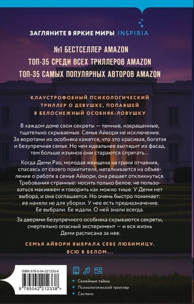 Когда Деми Рао, молодая женщина на грани отчаяния, спасаясь от своего похитителя, наталкивается на объявление о работе в семье Айвори, она решает откликнуться. Требования странные: носить только белое, не пользоваться макияжем и говорить как можно тише. У Деми нет выбора, и она соглашается. Но очень быстро понимает: ее наняли не для уборки. У нее есть предназначение. Ее выбрали. Ее ждали. О ней знали всегда.