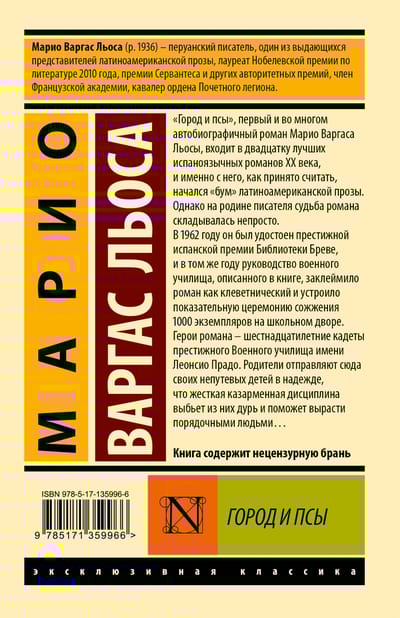 «Город и псы», первый и во многом автобиографичный роман Марио Варгаса Льосы, входит в двадцатку лучших испаноязычных романов ХХ века, и именно с него, как принято считать, начался «бум» латиноамериканской прозы. Однако на родине писателя судьба романа складывалась непросто. В 1962 году он был удостоен престижной испанской премии Библиотеки Бреве, и в том же году руководство военного училища, описанного в книге, заклеймило роман как клеветнический и устроило показательную церемонию сожжения 1000 экземпляров на школьном дворе.