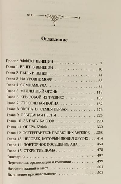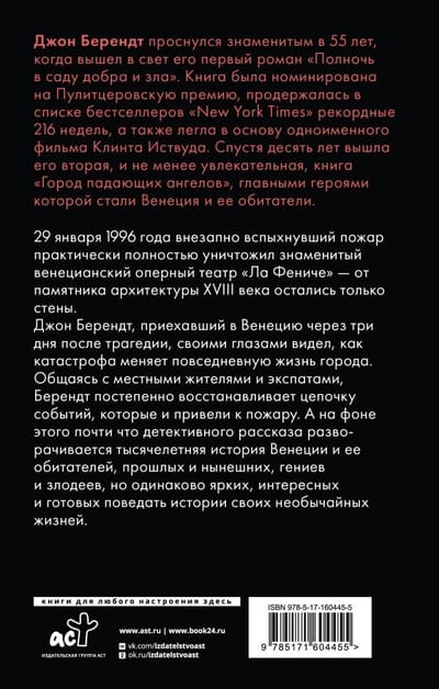 Джон Берендт, приехавший в Венецию через три дня после трагедии, своими глазами видел, как катастрофа меняет повседневную жизнь города. Общаясь с местными жителями и экспатами, Берендт постепенно восстанавливает цепочку событий, которые и привели к пожару. А на фоне этого почти что детективного рассказа разворачивается тысячелетняя история Венеции и ее обитателей, прошлых и нынешних, гениев и злодеев, но одинаково ярких, интересных и готовых поведать истории своих необычайных жизней.