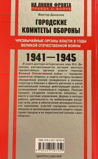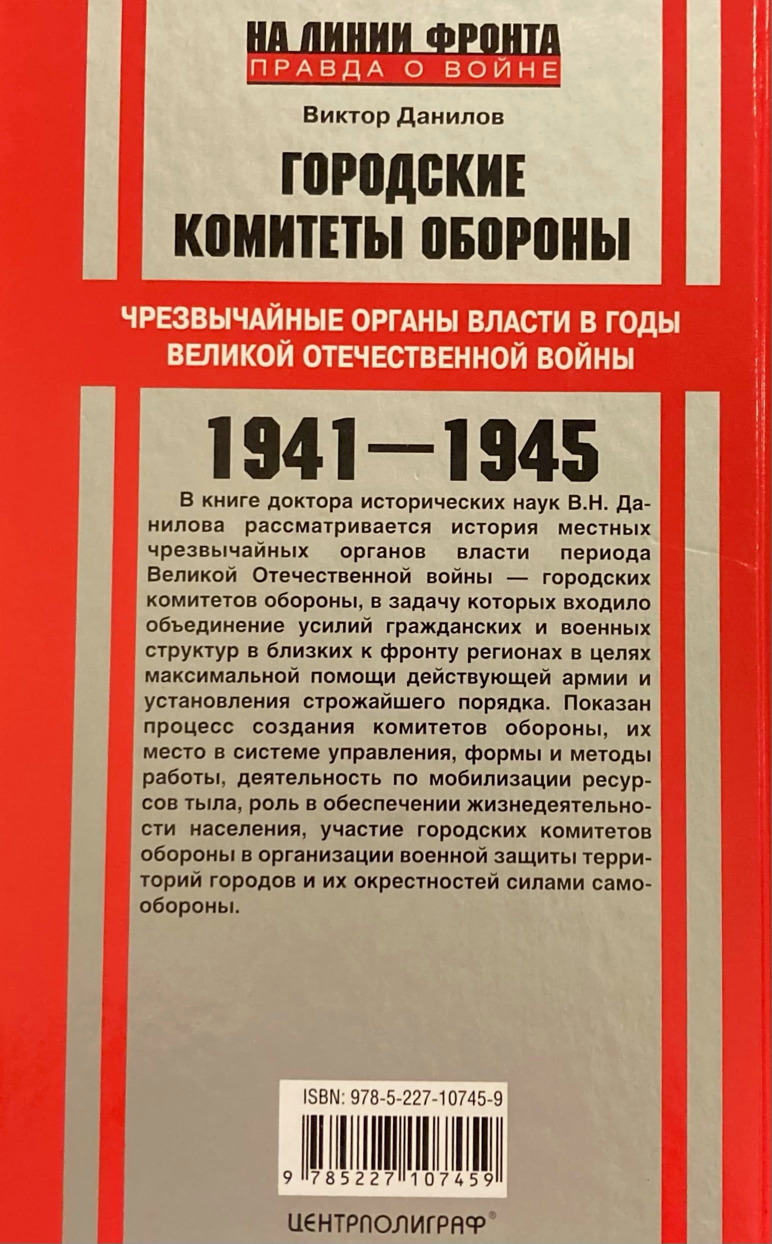В книге доктора исторических наук В.Н. Данилова рассматривается история местных чрезвычайных органов власти периода Великой Отечественной войны — городских комитетов обороны, в задачу которых входило объединение усилий гражданских и военных структур в регионах, близких к фронту, в целях максимальной помощи действующей армии и установления строжайшего порядка. Показан процесс создания комитетов обороны, их место в системе управления, формы и методы работы, деятельность по мобилизации ресурсов тыла, роль в обеспечении жизнедеятельности населения, участие городских комитетов обороны в организации военной защиты территорий городов и их окрестностей силами самообороны.