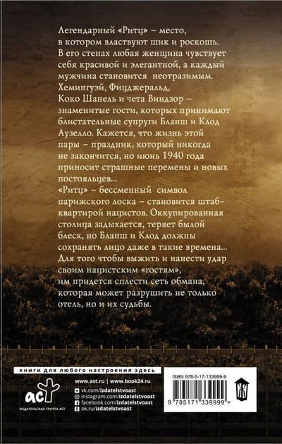 Хемингуэй, Фицджеральд, Коко Шанель и чета Виндзор  –знаменитые гости, которых принимают блистательные супруги Бланш и Клод Аузелло. Кажется, что жизнь этой пары – праздник, которой никогда не закончится, но июнь 1940 года приносит страшные перемены и новых постояльцев …    "Ритц" – бессменный  символ парижского лоска, становится штаб-квартирой нацистов. Оккупированная столица задыхается, теряет былой блеск, но Бланш и Клод должны сохранять лицо даже в такие времена… Для того чтобы выжить и нанести удар своим нацистским "гостям", им придется сплести сеть обмана, которая может разрушить не только отель, но и их судьбы.
