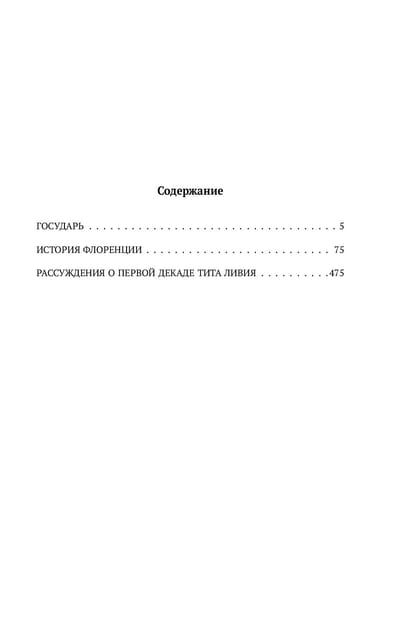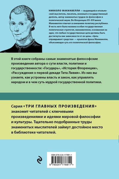 В книге «Государь. История Флоренции. Рассуждения о первой декаде Тита Ливия» собраны три главных произведения Никколо Макиавелли, раскрывающие его взгляды на политику, развитие государства и феномен власти. Идеи выдающегося политика, философа и писателя Возрождения до сих пор остаются актуальными для всех, кого интересует как политика родной страны, так и международные отношения. В честь Макиавелли была названа особая государственная политическая стратегия — макиавеллизм, основанная на идее, что любые государственные цели должны быть достигнуты вне зависимости от их цены. «Цель оправдывает средства» — крылатая фраза Макиавелли, объясняющая суть его политической философии. Из этой книги вы узнаете, как управлять государством, каковы признаки достойного правителя, как народ может влиять на развитие своей страны. Никколо Макиавелли (1469—1527) — выдающийся итальянский политический деятель, философ и писатель, секретарь второй канцелярии Флоренции, занимавшийся дипломатическими связями республики.