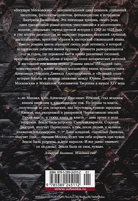 «Государи Московские» — монументальный цикл романов, созданный писателем, филологом-русистом, фольклористом и историком Дмитрием Балашовым. Эта эпическая хроника, своего рода один грандиозный роман-эпопея, уместившийся в многотомное издание, охватывает период русской истории с 1263 до 1425 года и уже многие десятилетия не перестает поражать читателей глубиной, масштабностью, яркостью образов и мастерской стилизацией языка. Вместе романы цикла образуют своего рода летопись, в которой исторические события жизни крупных княжеств разворачиваются год за годом, где отражены быт и нравы различных сословий, представлены судьбы, облик и характер сотен исторических деятелей. Саблями татар добыл князь Александр Невский золотой стол владимирский — для себя, для своих детей. Досталась ему русская земля в крови и пепле сожженных городов, под гнетом татарской власти. Много сил положено на ее устройство, но еще больше трудов впереди… В настоящий том вошли первые романы цикла: «Младший сын», повествующий о жизни первого московского князя, младшего сына Александра Невского Даниила Александровича, и «Великий стол» — история борьбы за великое княжение между Юрием Даниловичем Московским и Михаилом Ярославичем Тверским в начале XIV века.