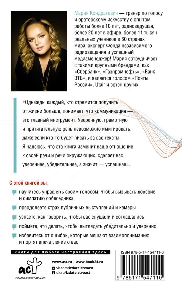 Можно делать тосты по утрам. Это будет называться «готовить завтрак». А можно делать это как шеф-повар — и это тоже «готовить завтрак». Так и в речи. Говорить умеют многие, убеждать — нет. Хотите, чтобы вас слушали и соглашались? Говорить эффективно и добиваться успеха? Значит, эта книга для вас.Вместе с автором, тренером по ораторскому искусству с опытом более 10 лет вы:- научитесь управлять своим голосом, чтобы вызывать доверие и симпатию собеседника;- преодолеете страх публичных выступлений и камеры;поймете, что делать, чтобы выглядеть убедительно и уверенно;- избавитесь от ошибок, которые мешают взаимопониманию и портят впечатление о вас.Автор с помощью своей методики и практик пошагово учит, как говорить и вести себя с разными собеседниками и перед разной аудиторией, чтобы убедить их, покорить и добиться своих целей.