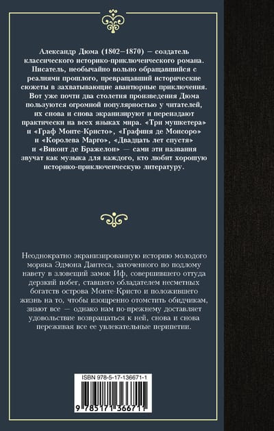 Неоднократно экранизированную историю молодого моряка Эдмона Дантеса, заточенного по подлому навету в зловещий замок Иф, совершившего оттуда дерзкий побег, ставшего обладателем несметных богатств острова Монте-Кристо и положившего жизнь на то, чтобы изощренно отомстить обидчикам, знают все - однако нам по-прежнему доставляет удовольствие возвращаться к ней, снова и снова переживая все ее увлекательные перипетии.