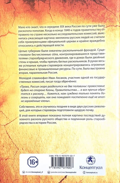 Задача книги – показать влияние, которое имел религиозный раскол на ход отечественной истории после XVII столетия, и придать изучению старообрядчества новые смыслы.