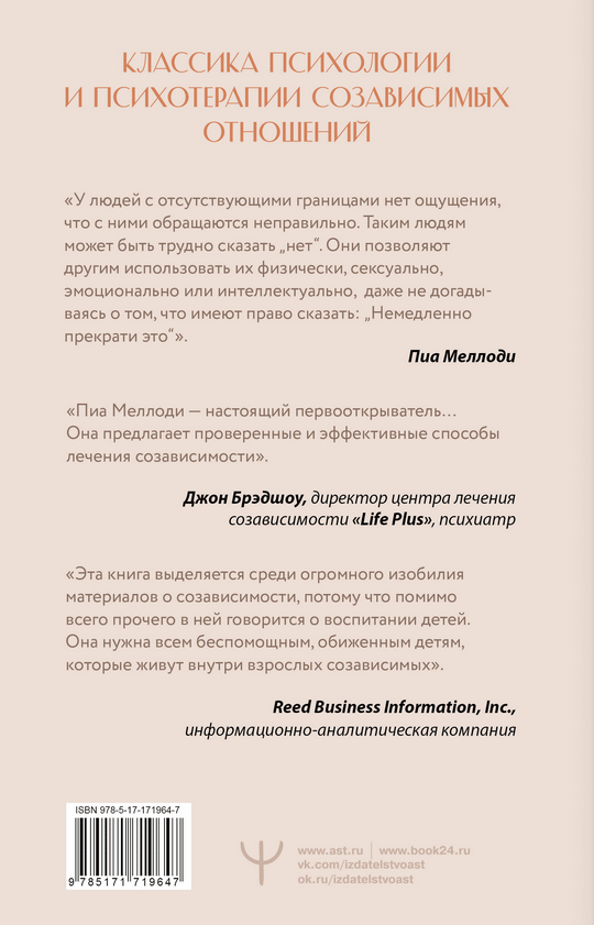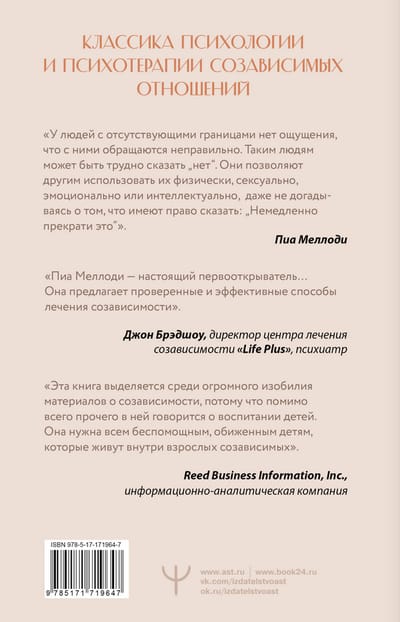 Пиа Меллоди — всемирно известный лектор, автор нескольких бестселлеров и специалист по работе с детскими травмами. Ее книги переведены на многие языки. Более 25 лет Пиа Меллоди работала в одном из лучших реабилитационных центров США — The Meadows Treatment Center.
