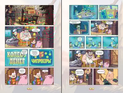 Графический роман «Гравити Фолз» — настоящая находка для любого из десятков тысяч фанатов мегапопулярного анимационного сериала, который идет на телеканале Disney. Сюжеты 13, 14 и 15 серий первого сезона в формате комикса порадуют и тех, кто давно и серьезно "подсел" на истории о приключениях Диппера и Мэйбл, и тех, кто только знакомится с ними.