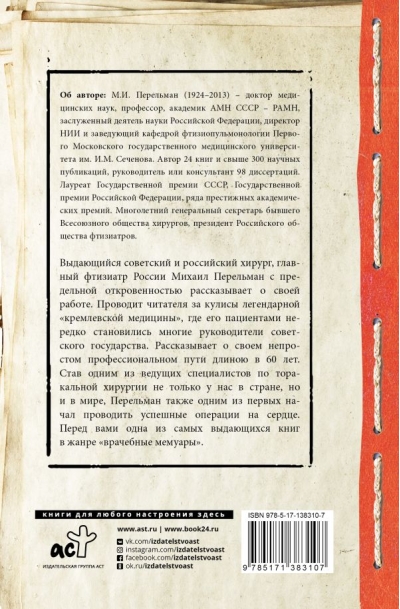 Выдающийся советский и российский хирург, главный фтизиатр России Михаил Перельман с предельной откровенностью рассказывает о своей работе. Проводит читателя за кулисы легендарной «кремлевской медицины», где его пациентами нередко становились многие руководители советского государства. Рассказывает о своем непростом профессиональном пути длиною в 60 лет. Став одним из ведущих специалистов по торакальной хирургии не только у нас в стране, но и в мире, Перельман одним из первых начал проводить успешные операции на сердце. Перед Вами одна из самых ярких книг в жанре «врачебные мемуары».