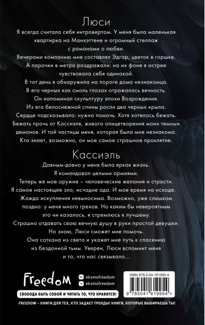 Впервые от автора-феномена сентиментальной прозы Эммы Скотт – мистическая, сверхъестественная история любви демона и смертной девушки сквозь череду жизней. Такого у писательницы вы еще не читали, и вам непременно понравится! Эта история содержит в себе элементы фэнтези, но, как и в других книгах Эммы, на первом плане – глубокие чувства, обжигающая страсть, вопросы личного пути. Даже если сверхъестественное — не совсем ваша тема, все равно прочтите этот роман, поскольку вопросы, поднимаемые писательницей, найдут отклик у всех, кто когда-либо любил и терял, и взял на себя смелость принять в сердце эту единственную любовь, данную свыше. Люси – тихая, застенчивая мечтательница. Кассиэль – одинокий, саркастичный демон. Он приходит в ее мир, чтобы найти спасение. А она обретает в нем саму себя. В этом романе: паранормальное (демоны, ангелы), неземная любовь, шанс на искупление, тоска по вечному. Невероятная история, которая придется по душе всем, кому надоела приторная сентиментальная проза. Этот роман – ода любви, интровертности, сердцу с горем внутри. Он о преодолении личных демонов, борьбе друг за друга и за мир, в котором мы живем. Эмма глубоко затрагивает тему жизни души в оковах вечности, приводит глоссарий и дает свои определения понятиям потустороннего мира. А еще в книге много отсылок к шумерской мифологии, что добавляет колориту уникальности.