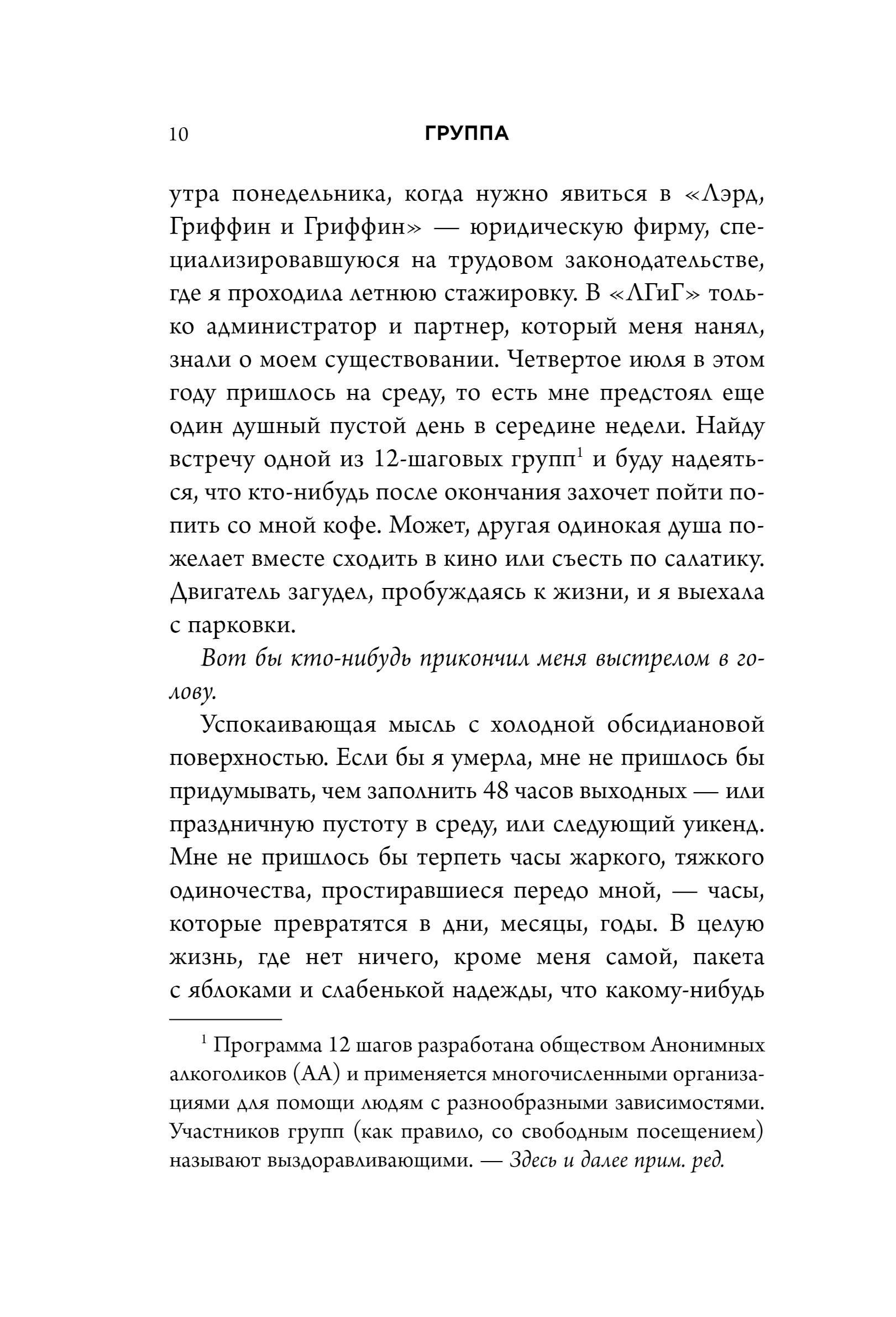 «Группа» похожа на психотерапевтическую версию «Секса в большом городе». Автор, она же главная героиня Кристи ─ совсем как Кэрри Брэдшоу ─ успешная колумнистка популярных СМИ, находится в отчаянном поиске идеального мужчины. А еще Кристи Тейт лучшая ученица в своем классе юридической школы, она практически получила престижное место работы и, наконец, поборола расстройство пищевого поведения. И в ее жизни, кажется, все прекрасно... Но почему же она страдает от ужасного одиночества, боится любых отношений и сходит с ума от суицидальных мыслей? Кристи едет в машине и мечтает о том, чтобы кто-нибудь выстрелил ей в голову. Единственное ее спасение ─ харизматичный психотерапевт доктор Розен, который уверяет, что только групповая терапия способна изменить ее жизнь. И все, что ей нужно сделать, это быть предельно откровенной ─ рассказать о привычках в еде, детстве, родителях, сексуальных связях. Доктор Розен выписывает ей рецепт из семи слов: «Вам не нужно лекарство. Вам нужен свидетель».