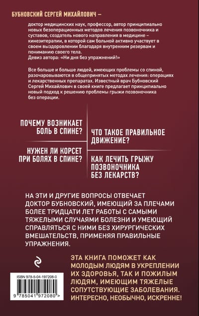 БУБНОВСКИЙ СЕРГЕЙ МИХАЙЛОВИЧ – доктор медицинских наук, профессор, автор принципиально новых безоперационных методов лечения позвоночника и суставов, создатель нового направления в медицине – кинезитерапии, в которой сам больной активно участвует в своем выздоровлении благодаря внутренним резервам и пониманию своего тела.