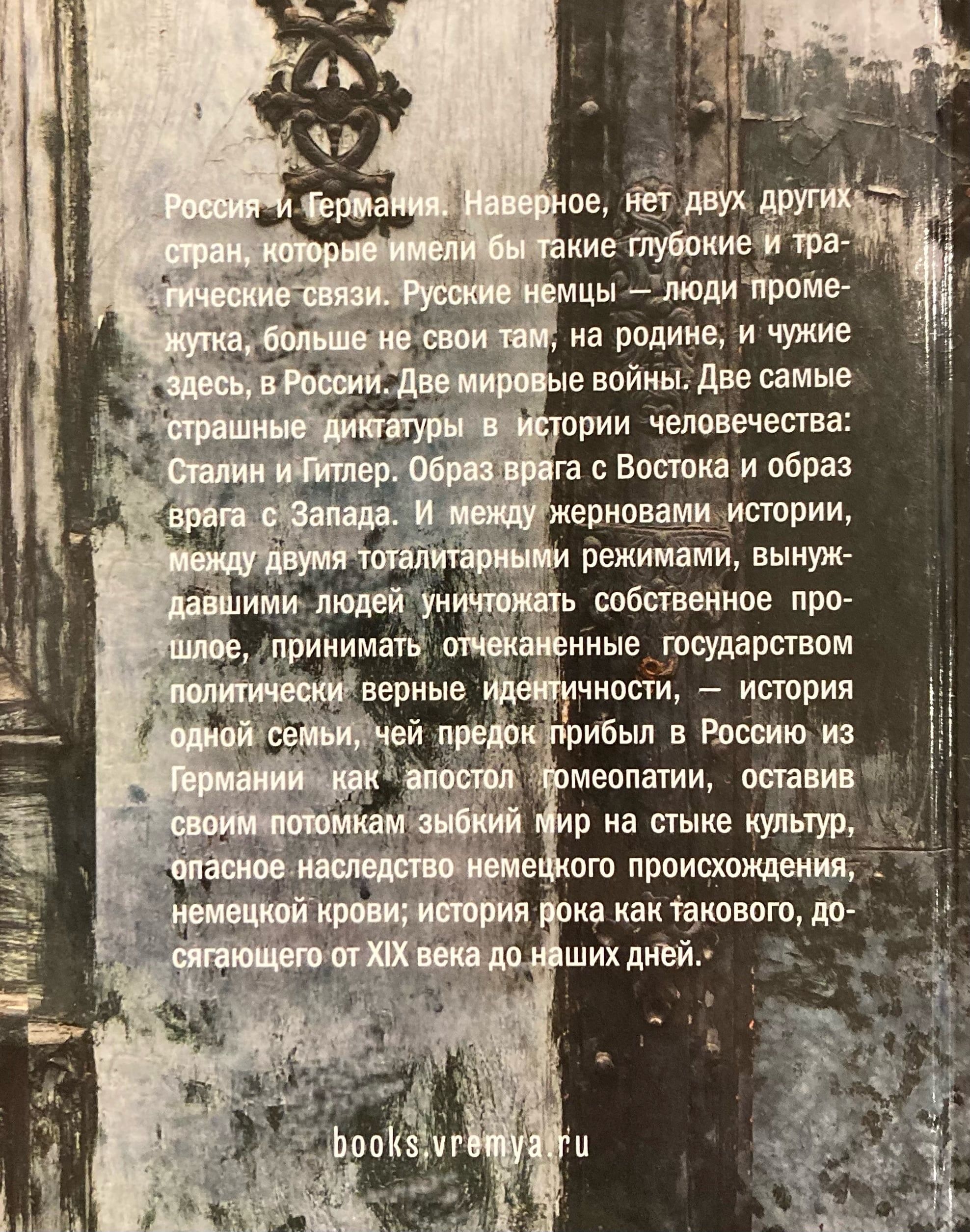 Россия и Германия. Наверное, нет двух других стран, которые имели бы такие глубокие и трагические связи. Русские немцы - люди промежутка, больше не свои там, на родине, и чужие здесь, в России. Две мировые войны. Две самые страшные диктатуры в истории человечества: Сталин и Гитлер. Образ врага с Востока и образ врага с Запада. И между жерновами истории, между двумя тоталитарными режимами, вынуждавшими людей уничтожать собственное прошлое, принимать отчеканенные государством политически верные идентичности, - история одной семьи, чей предок прибыл в Россию из Германии как апостол гомеопатии, оставив своим потомкам зыбкий мир на стыке культур, опасное наследство немецкого происхождения, немецкой крови; история рока как такового, досягающего от XIX века до наших дней.