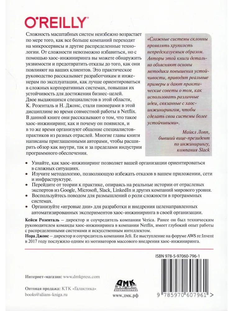 Двое выдающихся специалистов в этой области, К. Розенталь и Н. Джонс, стали пионерами в этой дисциплине во время совместной работы в Netflix. В данной книге они рассказывают о том, что такое хаос-инжиниринг, как и почему он появился, и в то же время организуют общение специалистов-практиков из разных отраслей. Многие главы книги написаны приглашенными авторами, чтобы расширить обзор как внутри, так и за пределами индустрии программного обеспечения.