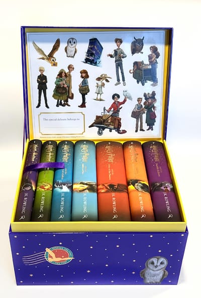 This starry book trunk, decorated with magical owls and postmarks, is the ultimate way to escape to Hogwarts! Seven beautiful hardbacks are collected inside, featuring spectacular cover illustrations by Jonny Duddle, as well as quizzes, listicles and fun facts at the back of each story. This special delivery arrives in a protective cardboard sleeve and also includes a sheet of colourful stickers. There's even a special name label for readers to personalise their own Harry Potter set.