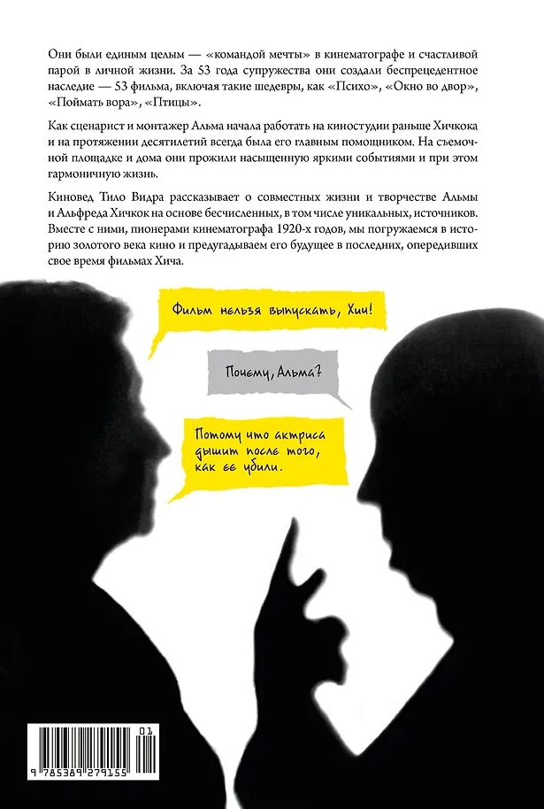 Писатель и киновед Тило Видра создал первую двойную биографию легендарной творческой пары «Альма и Альфред Хичкок», опираясь на огромный массив документов и многочисленные интервью. Внимательно и восхищенно наблюдая за главными событиями и фильмами в жизни этой пары, автор создал великолепную работу по истории кино ХХ века.