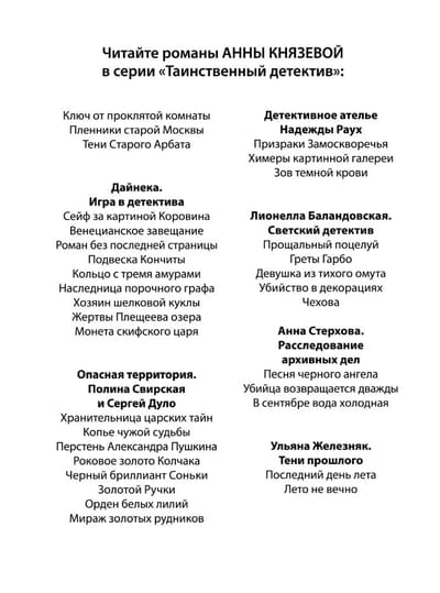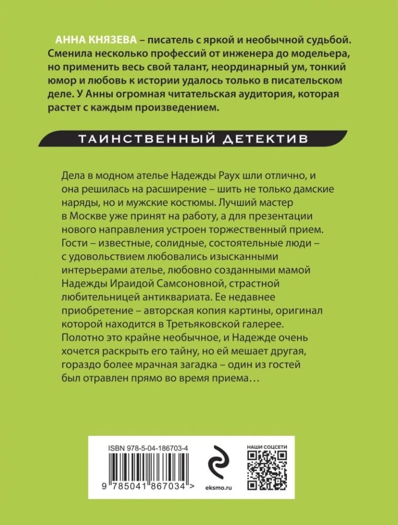 Дела в модном ателье Надежды Раух шли отлично, и она решилась на расширение — шить не только дамские наряды, но и мужские костюмы. Лучший мастер в Москве уже принят на работу, а для презентации нового направления устроен торжественный прием. Гости — известные, солидные, состоятельные люди — с удовольствием любовались изысканными интерьерами ателье, любовно созданными мамой Надежды Ираидой Самсоновной, страстной любительницей антиквариата. Ее недавнее приобретение — авторская копия картины, оригинал которой находится в Третьяковской галерее. Полотно это крайне необычное, и Надежде очень хочется раскрыть его тайну, но ей мешает другая, гораздо более мрачная загадка — один из гостей был отравлен прямо во время приема…