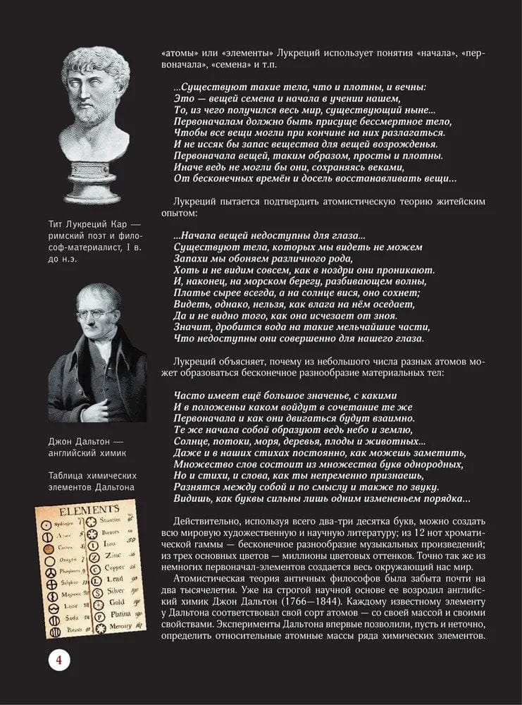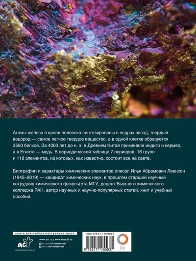 Атомы железа в крови человека синтезированы в недрах звезд, твердый водород – самое легкое твердое вещество, а в одной клетке образуется 3500 белков. За 4000 лет до н.э. в Древнем Китае применяли индиго и кермес, а в Египте – медь. В периодической таблице 7 периодов, 18 групп и 118 элементов, из которых, как известно, состоит все на свете. Биографии и характеры химических элементов описал Илья Абрамович Леенсон (1945–2019) – кандидат химических наук, в прошлом старший научный сотрудник химического факультета МГУ, доцент Высшего химического колледжа РАН, автор научных и научно-популярных статей, книг и учебных пособий.