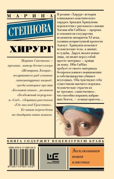 В романе «Хирург» история гениального пластического хирурга Аркадия Хрипунова переплетена с рассказом о жизни Хасана ибн Саббаха - пророка и основателя государства исламитов-низаритов ХI века, хозяина неприступной крепости Аламут. Хрипунов изменяет человеческие тела, а значит и судьбы. Даруя людям новые лица, он видит перед собой просто материал - хрящи да кожу. Ибн Саббах требует от своего материала беспрекословного повиновения и собственноручно убивает неугодных. Оба чувствуют себя существами высшего порядка, человеческие страсти их не трогают, единственное, что способно поразить избранных Богом, - земная красота...
