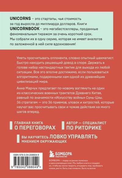 Анна Марчук, специалист по риторике и соавтор электронного журнала Teacher’s Assistant, предлагает новый взгляд на один из классических военных трактатов Древнего Китая, равный по значимости «Искусству войны» Сунь Цзы. В своей книге она рассказывает про 36 стратагем, которые помогут вам научиться просчитывать ситуацию на несколько шагов вперед, управлять событиями, распознавать манипуляции и принимать непростые решения.