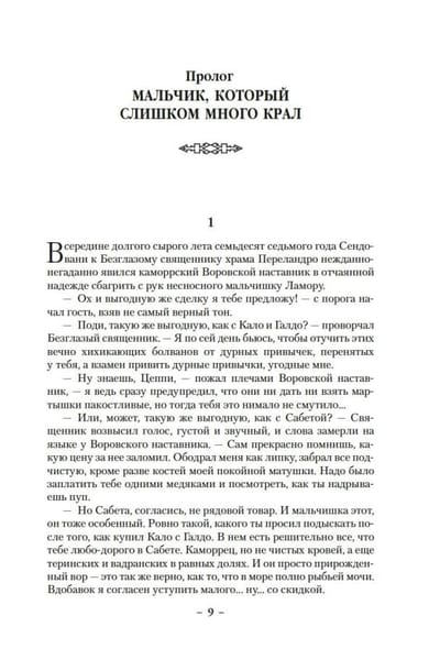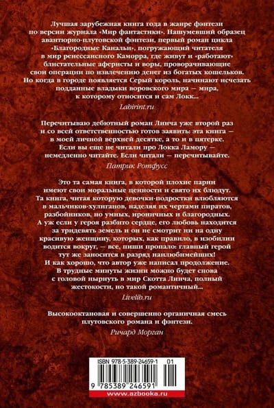 Однажды Воровской наставник явился к отцу Цеппи, Безглазому священнику храма Переландро, чтобы сбыть с рук несносного мальчишку Локка Ламору. Ведь Ламора, хоть и прирожденный вор, был воистину несносен, и для его исключительных талантов город-государство Каморр — прорезанное десятками каналов, раскинувшееся на множестве островов под сенью исполинских башен из стекла Древних — могло оказаться тесным. С течением лет Локку и его Благородным Канальям сходит с рук многое, вплоть до нарушения Тайного уговора, регулирующего всю жизнь Путных людей Каморра, но вот в закулисье преступного сообщества появляется Серый король — безжалостный, невидимый и неуязвимый убийца, — внося свои коррективы в очередную гениальную аферу Локка…