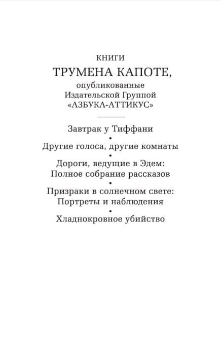 Трумен Капоте, автор таких бестселлеров, как «Завтрак у Тиффани» (повесть, прославленная в 1961 году экранизацией с Одри Хепберн в главной роли), «Голоса травы», «Другие голоса, другие комнаты», «Призраки в солнечном свете» и другие, входит в число крупнейших американских прозаиков XX века.