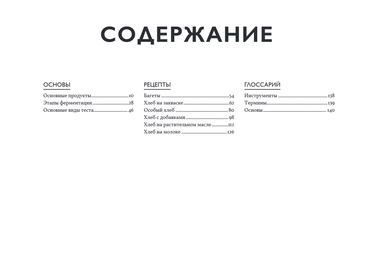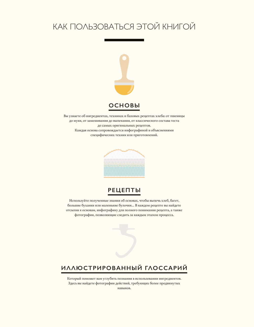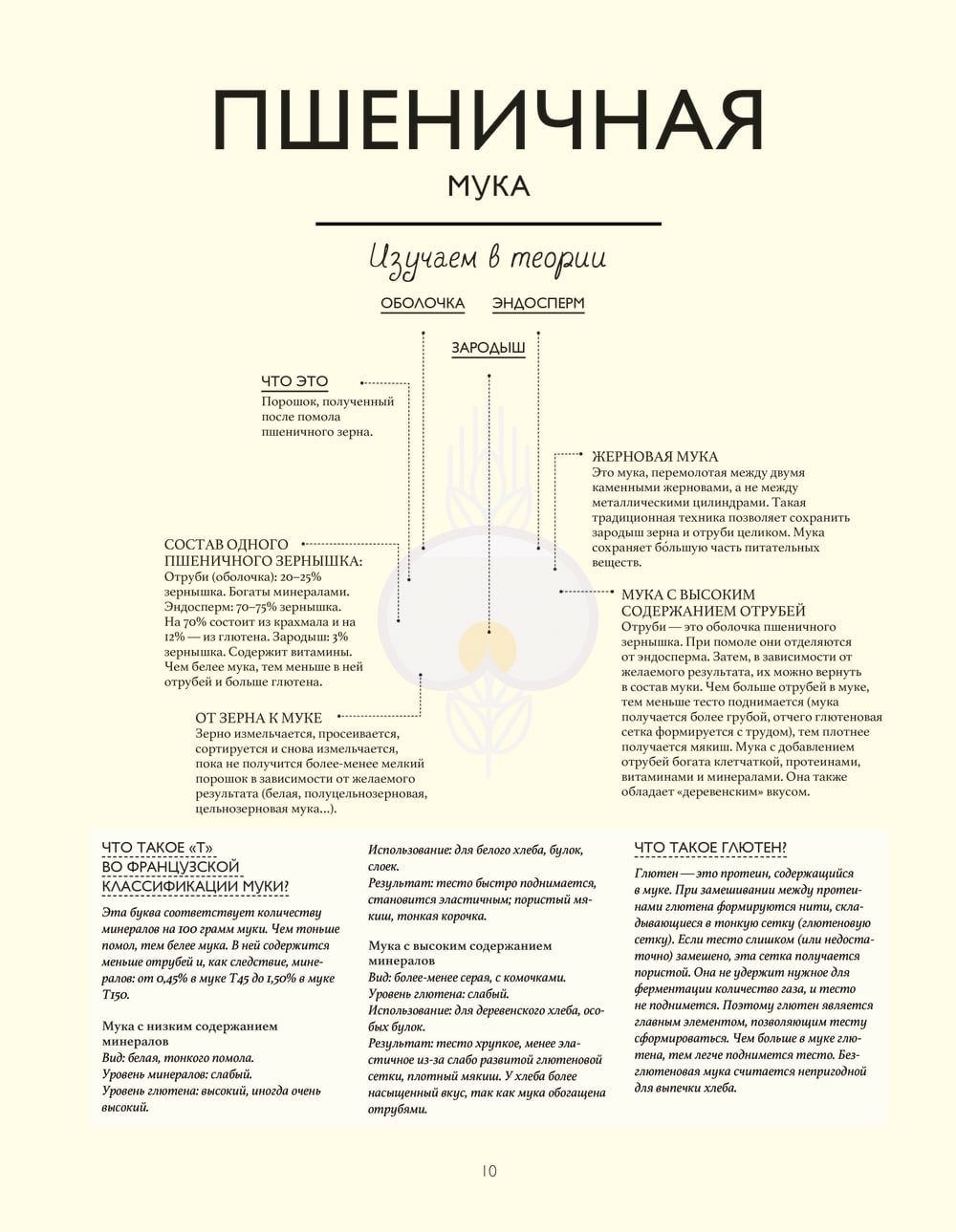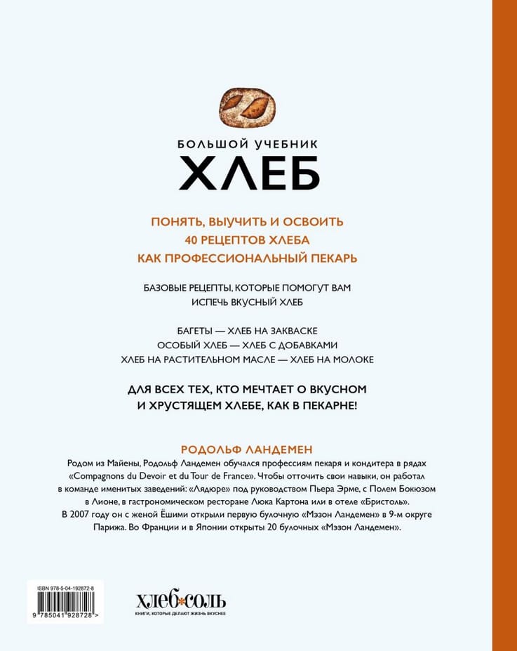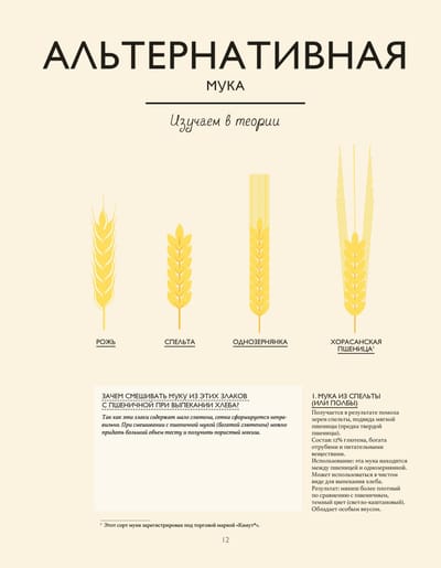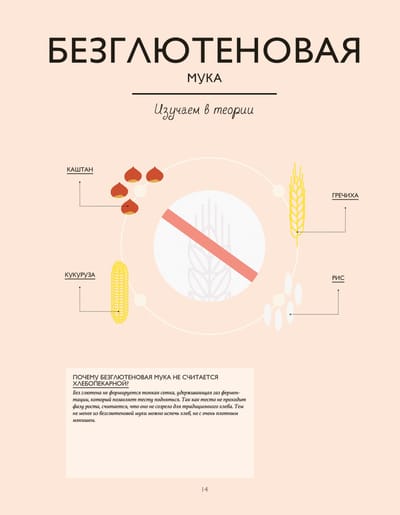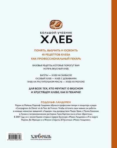 Из нее вы сначала узнаете об основах хлебопечения: ингредиентах, техниках и базовых рецептах хлеба: от пшеницы до муки, от замешивания до выпекания, от классического состава теста до самых оригинальных рецептов. Каждая основа сопровождается инфографикой и объяснениями специфических техник или приготовлений. Далее вы используете полученные знания об основах, чтобы выпечь хлеб, багет, большие буханки или маленькие булочки. В каждом рецепте вы найдете отсылки к основам, инфографику для полного понимания рецепта, а также фотографии, позволяющие следить за каждым этапом процесса. Иллюстрированный глоссарий в конце книги поможет вам углубить познания в использовании ингредиентов.