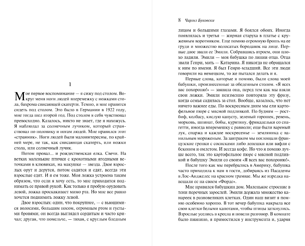 «Хлеб с ветчиной» — самый проникновенный роман Буковски. Подобно «Приключениям Гекльберри Финна» и «Над пропастью во ржи», он написан с точки зрения впечатлительного ребенка, имеющего дело с двуличием, претенциозностью и тщеславием взрослого мира. Ребенка, постепенно открывающего для себя алкоголь и женщин, азартные игры и мордобой, Д. Г. Лоуренса и Хемингуэя, Тургенева и Достоевского.