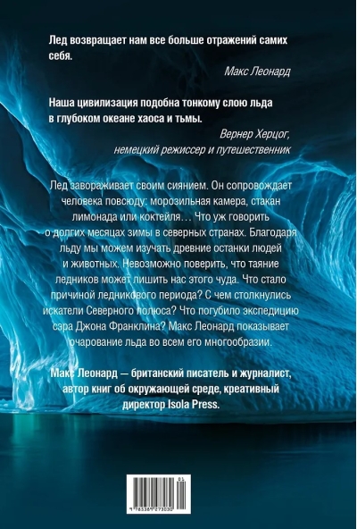 «Лед был одним из важнейших мостов, соединяющих нас с миром природы… Он влиял на развитие человека еще в глубокой древности, сопровождал земледельцев и кочевников доисторической эпохи… Безо льда мы не смогли бы прокормить себя и лечить больных, как мы это сейчас делаем. Наука не развивалась бы по тем направлениям, по которым она развивается. Безо льда наши города, деревни, моря и океаны выглядели бы совершенно иначе, а многие шедевры, украшающие галереи и библиотеки, попросту не существовали бы» (Макс Леонард).