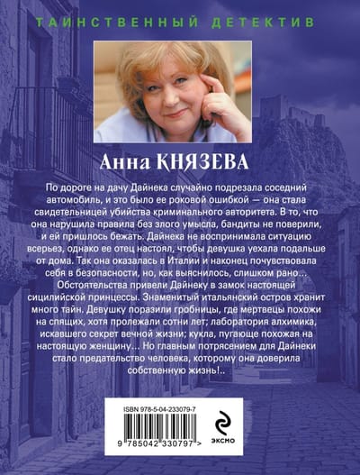 По дороге на дачу Дайнека случайно подрезала соседний автомобиль, и это было ее роковой ошибкой — она стала свидетельницей убийства криминального авторитета. В то, что она нарушила правила без злого умысла, бандиты не поверили, и ей пришлось бежать. Дайнека не воспринимала ситуацию всерьез, однако ее отец настоял, чтобы девушка уехала подальше от дома. Так она оказалась в Италии и наконец почувствовала себя в безопасности, но, как выяснилось, слишком рано… Обстоятельства привели Дайнеку в замок настоящей сицилийской принцессы. Знаменитый итальянский остров хранит много тайн. Девушку поразили гробницы, где мертвецы похожи на спящих, хотя пролежали сотни лет; лаборатория алхимика, искавшего секрет вечной жизни; кукла, пугающе похожая на настоящую женщину… Но главным потрясением для Дайнеки стало предательство человека, которому она доверила собственную жизнь!..