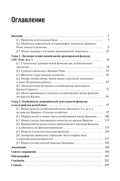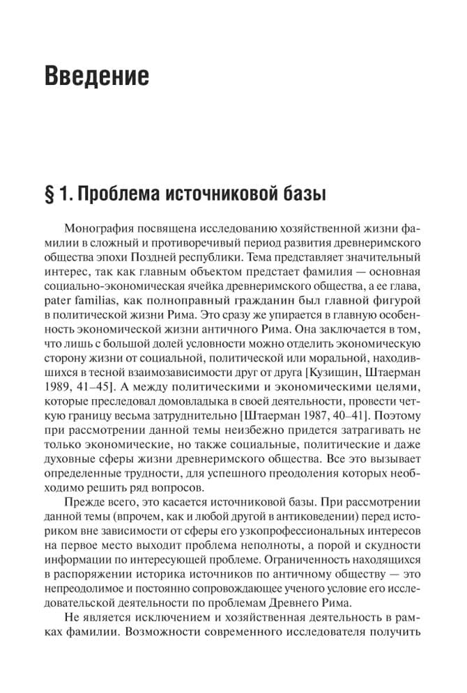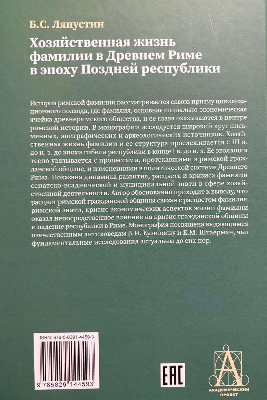 История римской фамилии рассматривается сквозь призму цивилизационного подхода, где фамилия, основная социально-экономическая ячейка древнеримского общества, и ее глава оказываются в центре римской истории. В монографии исследуется широкий круг письменных, эпиграфических и археологических источников. Хозяйственная жизнь фамилии и ее структура прослеживается с III в. до н. э. до эпохи гибели республики в конце I в. до н. э. Ее эволюция тесно увязывается с процессами, протекавшими в римской гражданской общине, и изменениями в политической системе Древнего Рима. Показана динамика развития, расцвета и кризиса фамилии сенатско-всаднической и муниципальной знати в сфере хозяйственной деятельности. Автор обоснованно приходит к выводу, что расцвет римской гражданской общины связан с расцветом фамилии римской знати, кризис экономических аспектов жизни фамилии оказал непосредственное влияние на кризис гражданской общины и падение республики в Риме. Монография посвящена выдающимся отечественным антиковедам В. И. Кузищину и Е.М. Штаерман, чьи фундаментальные исследования актуальны до сих пор.