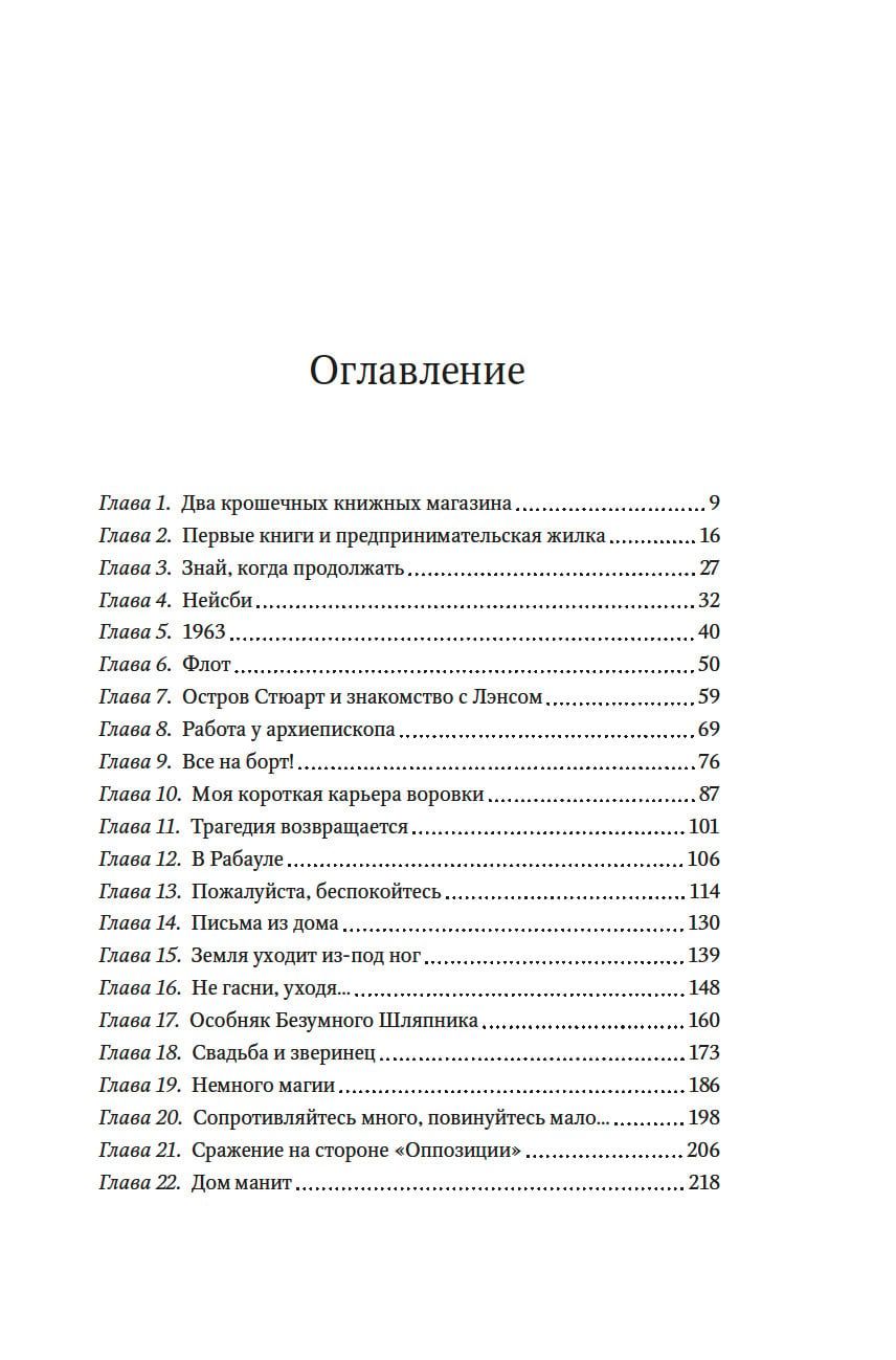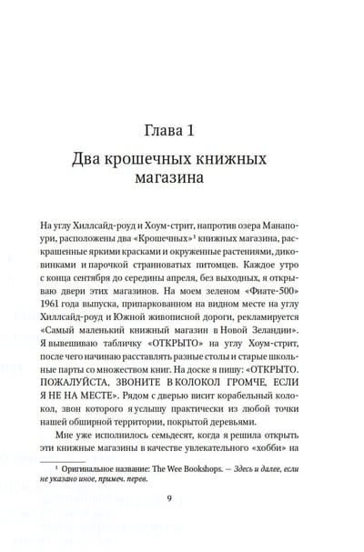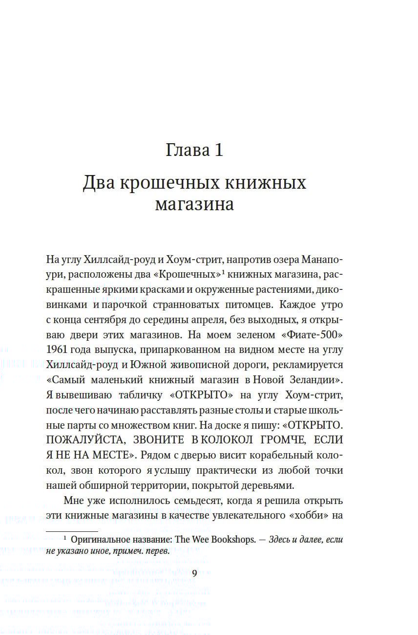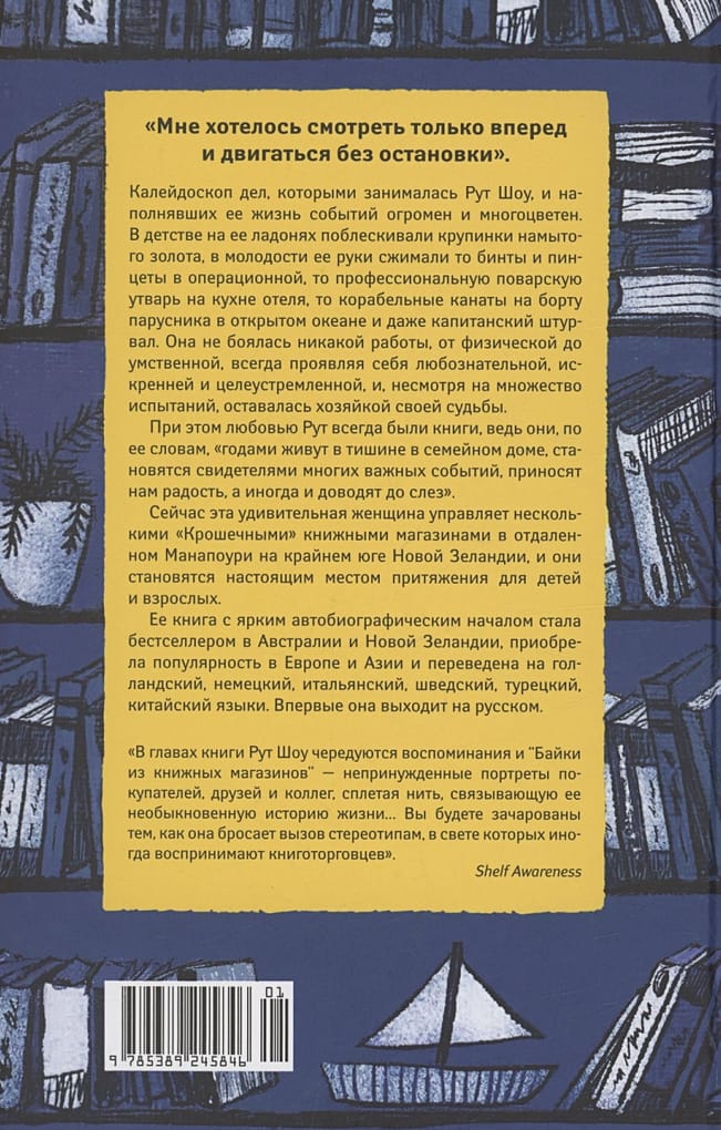 Рут Шоу искусно собирает воедино зарисовки из своих книжных магазинов в живописном уголке Новой Зеландии, размышления о любимых книгах и трогательные истории из своей насыщенной и разнообразной жизни. Она служила во флоте, была поваром, медсестрой, экономкой, предпринимателем, капитаном туристического судна... Стойкая, активная, эмоциональная, умеющая держать удары судьбы, Рут плавала по Тихому океану, попадала в лапы пиратов, работала в криминальном сиднейском районе Кингс-Кросс, становилась защитницей природы и вместе со своим мужем Лэнсом ходила на паруснике «Брейкси Гёрл», способном перевозить пассажиров на субантарктические острова. При этом любовью Рут всегда были книги — одно из лучших изобретений человечества, книги, хранящие тепло рук прежних поколений, дающие пищу для ума, заставляющие смеяться и плакать, позволяющие отвлечься от забот или, наоборот, проникнуться судьбами других, задуматься и сострадать. Уютные магазины, открытые ею в Манапоури, становятся настоящим местом притяжения для детей и взрослых, мужчин и женщин, местных жителей и туристов. Прочитав эту искреннюю книгу, вы наверняка захотите узнать больше о Рут и ее удивительной родине.
