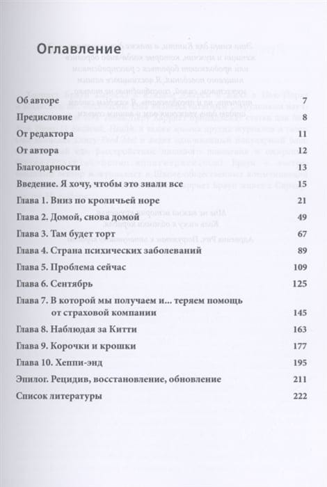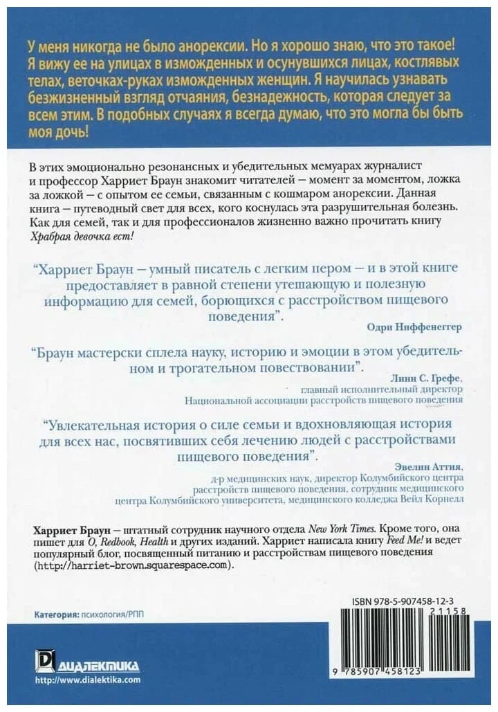 В этой книге описаны хроники сурового испытания семьи Браунов, борющейся с нервной анорексией Китти, удивительное путешествие, превращающее жизнь в почти невыносимую борьбу, которую пережили и Китти, и ее семья. Нервная анорексия приводит к глубоким психологическим и физиологическим изменениям в организме страдающего человека. Эти изменения часто настолько серьезны, что родители не узнают своего близкого. Зачастую компетентные, любящие родители, сталкиваясь с этой странной болезнью, становятся растерянными и дезорганизованными. Эта путаница часто заставляет их сомневаться в естественном инстинкте протянуть руку помощи своему чаду. Как следствие, они замирают перед лицом кажущейся подавляющей власти, которую анорексия имеет над их ребенком и над ними самими. История Браунов — это возвышающая драма, поскольку решимость и настойчивость родителей, а также смелые усилия Китти позволяют вырвать ее из лап расстройства пищевого поведения.